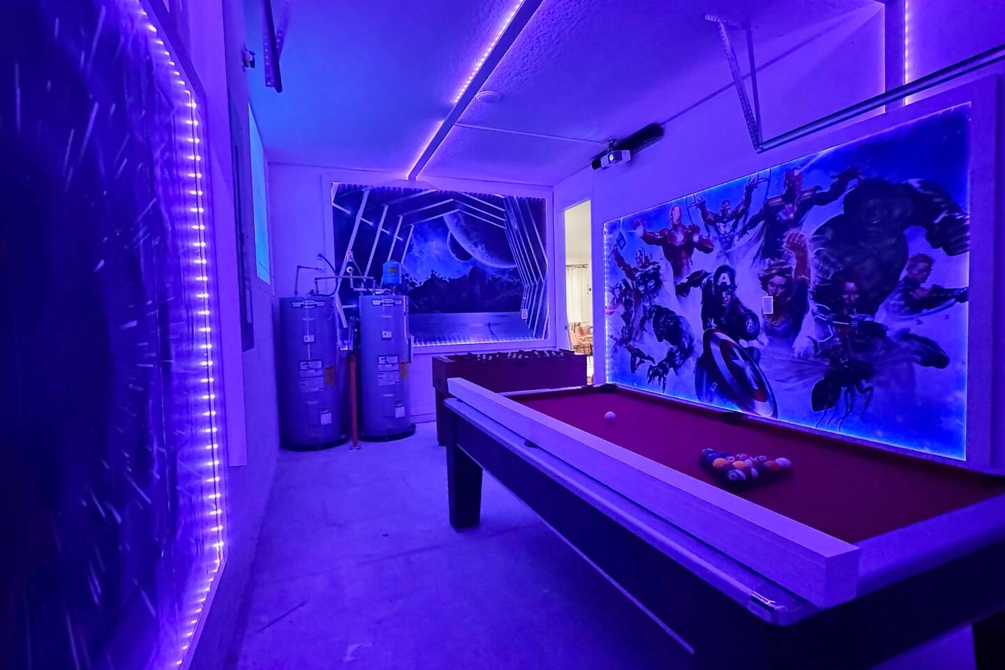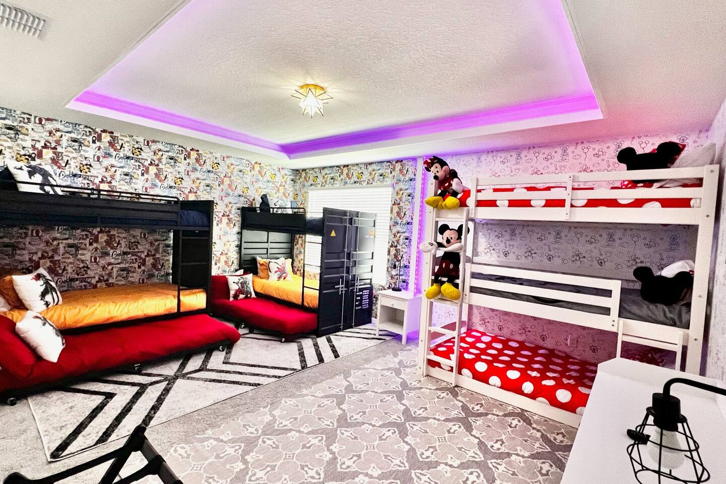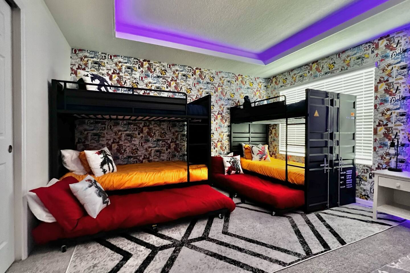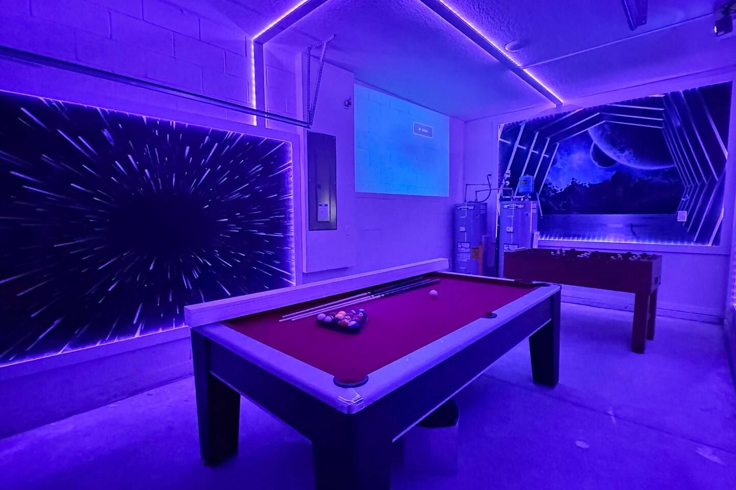 🎉GAME ROOM AND 7TH BEDROOM WERE COMPLETED IN FEBRUARY 2025🎉 Professionally designed, every detail has been carefully selected to ensure a fun and relaxing experience. With our themed bedrooms, step into the world of Harry Potter, Star Wars, Disney Princesses, Mickey Mouse, Avengers and brand new Wicked theme. But it doesn't end there, 4 king size rooms have been designed for the adults too! This spacious house will allow the whole family and friends to enjoy time together and still allow for the privacy and individual space you need. Our 7 bedroom 6.5 bath house accommodates up to 21 people including 2 infants/toddlers and comes with all the supplies you might need. No need to bring your Pack N Play or highchairs, we've got you covered! Pose for your family photos in front of our neon welcome sign and Florida inspired greenery wall! Solara Resort at Westside is a leading resort in the area not just because of its top rate amenities but because of the quality level of service provided by the staff committed to helping you have a great vacation. Stay in and set your own mood on the private covered lanai equipped with pool/hot tub/fire pit/BBQ and dining/lounging or watching movies and playing games in our theatre/game room. Explore the resort restaurants, game rooms, gym, water park, playground, volleyball/basketball courts. Or venture out to one of the world class theme parks, beaches or other attractions. We understand that your vacation is a special time to gather, relax and have fun together. We are committed to first class service, clear and helpful communications and transparency. Reach out anytime for a response within minutes. LAYOUT DESCRIPTION: Down stairs Bedroom 1(Green Room): 1 king bed 1 pack n play, en-suite bathroom with shower, private toilet and dual vanity, 3 people including 1 toddler/infant Bedroom 2(Blue Room): 1 king bed 1 pack n play, full hall bath with shower 3 people including 1 toddler/infant Upstairs Bedroom 3(Star Wars Room Docking Bay 94 on Tatooine): 1 king bed en-suite full bathroom with shower tub combo 2 people Bedroom 4(Harry Potter Gryffindor and Slytherin Dormitory): 2 full beds jack n Jill bathroom with private toilet shower tub combo and dual vanity 2 people Bedroom 5(Disney Princess Room ): 2 twin beds jack n Jill bathroom with private toilet shower tub combo and dual vanity 2 kids Bedroom 6(Avengers Compound/Mickey Mouse Clubhouse Room): 9 twin beds (3 triple bunk beds) en-suite full bathroom with dual vanity and shower 9 kids Bedroom 7 (Wicked’s Glinda and Elphaba’s dormitory): 1 king bed full hall bathroom with tub/shower combo 2 people Theater room is upstairs Game room has a foosball table, pool table, gaming desk, projector/sound bar and lights and decor. Located in the garage