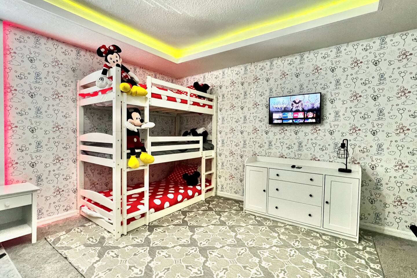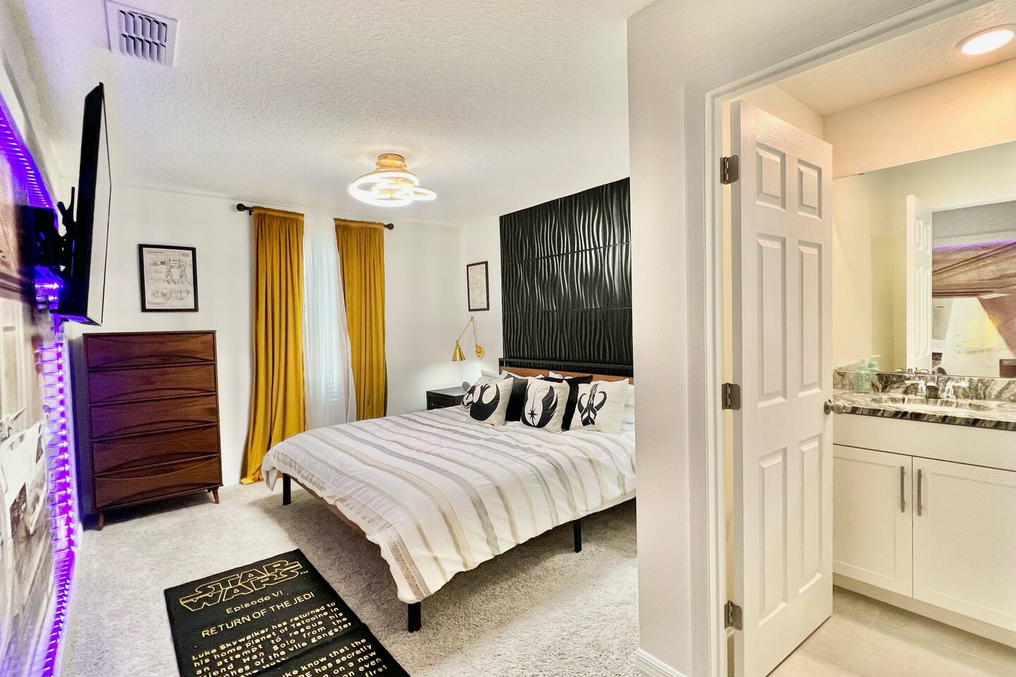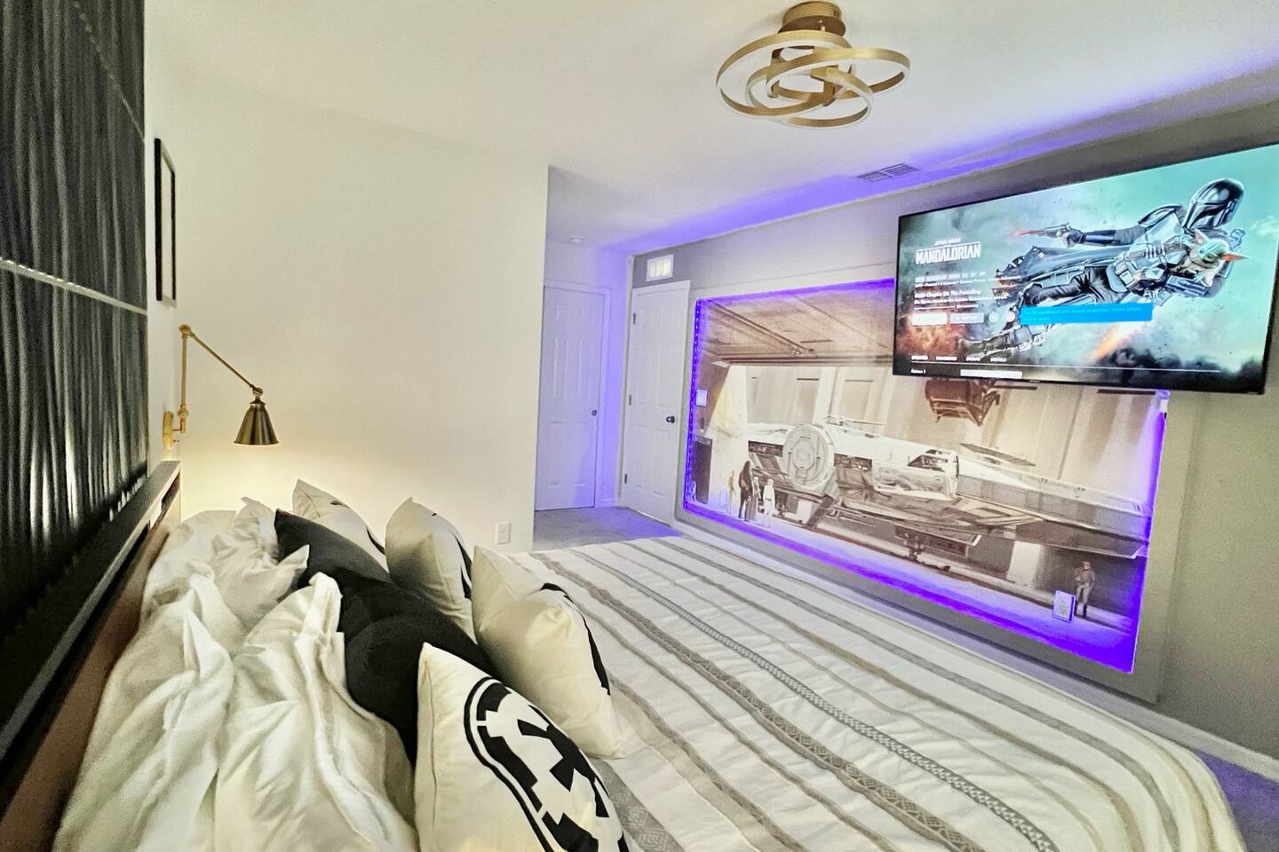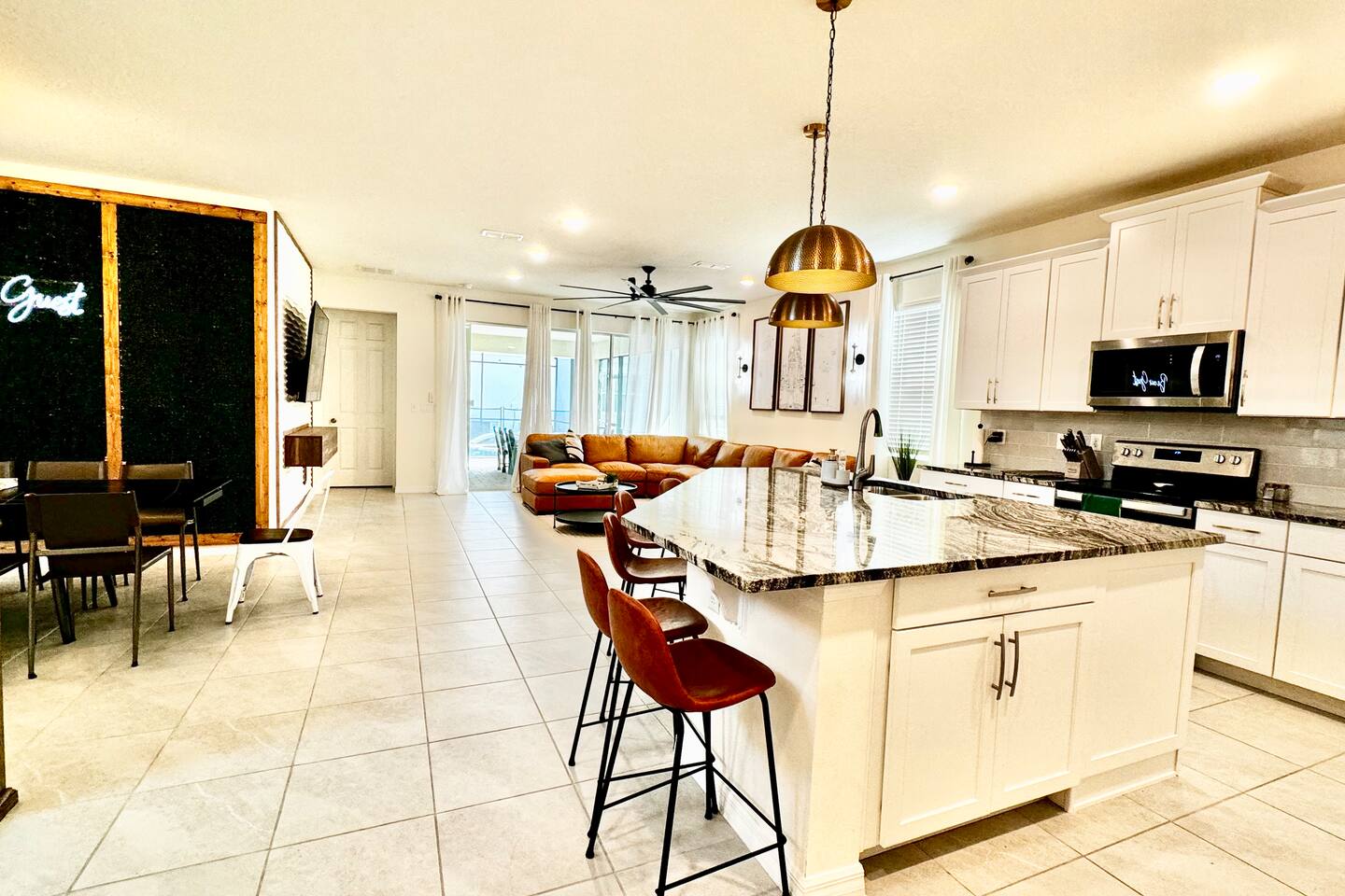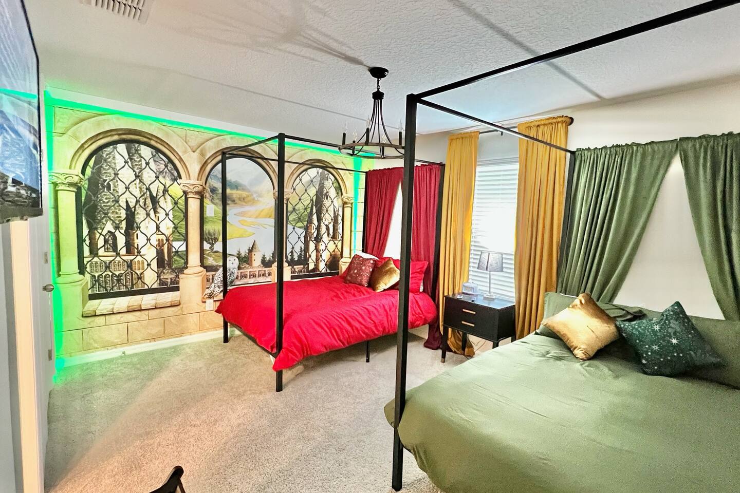 🎉GAME ROOM AND 7TH BEDROOM WERE COMPLETED IN FEBRUARY 2025🎉 Professionally designed, every detail has been carefully selected to ensure a fun and relaxing experience. With our themed bedrooms, step into the world of Harry Potter, Star Wars, Disney Princesses, Mickey Mouse, Avengers and brand new Wicked theme. But it doesn't end there, 4 king size rooms have been designed for the adults too! This spacious house will allow the whole family and friends to enjoy time together and still allow for the privacy and individual space you need. Our 7 bedroom 6.5 bath house accommodates up to 21 people including 2 infants/toddlers and comes with all the supplies you might need. No need to bring your Pack N Play or highchairs, we've got you covered! Pose for your family photos in front of our neon welcome sign and Florida inspired greenery wall! Solara Resort at Westside is a leading resort in the area not just because of its top rate amenities but because of the quality level of service provided by the staff committed to helping you have a great vacation. Stay in and set your own mood on the private covered lanai equipped with pool/hot tub/fire pit/BBQ and dining/lounging or watching movies and playing games in our theatre/game room. Explore the resort restaurants, game rooms, gym, water park, playground, volleyball/basketball courts. Or venture out to one of the world class theme parks, beaches or other attractions. We understand that your vacation is a special time to gather, relax and have fun together. We are committed to first class service, clear and helpful communications and transparency. Reach out anytime for a response within minutes. LAYOUT DESCRIPTION: Down stairs Bedroom 1(Green Room): 1 king bed 1 pack n play, en-suite bathroom with shower, private toilet and dual vanity, 3 people including 1 toddler/infant Bedroom 2(Blue Room): 1 king bed 1 pack n play, full hall bath with shower 3 people including 1 toddler/infant Upstairs Bedroom 3(Star Wars Room Docking Bay 94 on Tatooine): 1 king bed en-suite full bathroom with shower tub combo 2 people Bedroom 4(Harry Potter Gryffindor and Slytherin Dormitory): 2 full beds jack n Jill bathroom with private toilet shower tub combo and dual vanity 2 people Bedroom 5(Disney Princess Room ): 2 twin beds jack n Jill bathroom with private toilet shower tub combo and dual vanity 2 kids Bedroom 6(Avengers Compound/Mickey Mouse Clubhouse Room): 9 twin beds (3 triple bunk beds) en-suite full bathroom with dual vanity and shower 9 kids Bedroom 7 (Wicked’s Glinda and Elphaba’s dormitory): 1 king bed full hall bathroom with tub/shower combo 2 people Theater room is upstairs Game room has a foosball table, pool table, gaming desk, projector/sound bar and lights and decor. Located in the garage