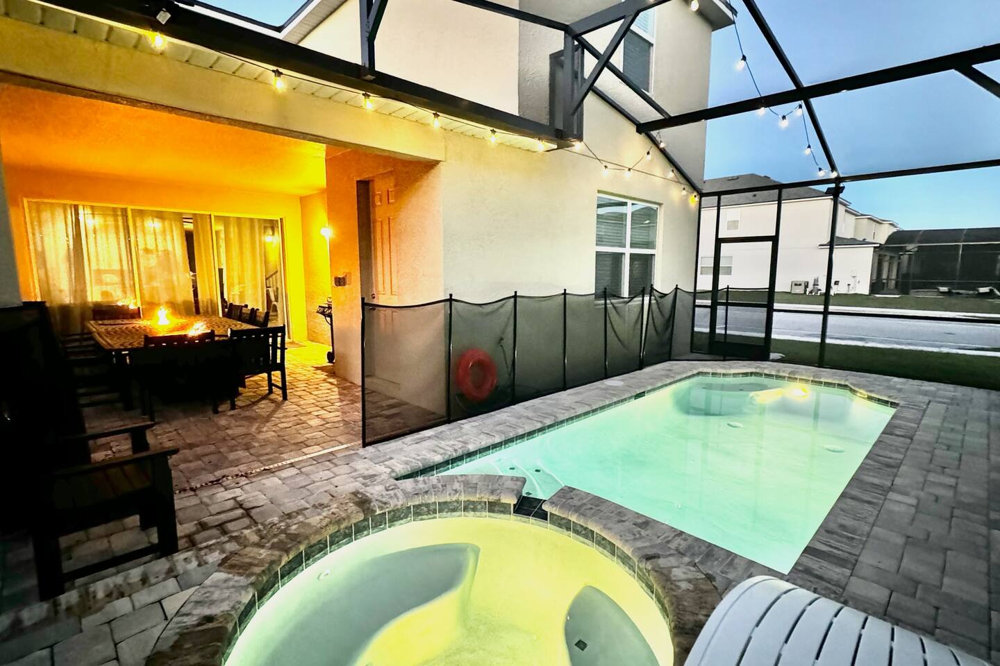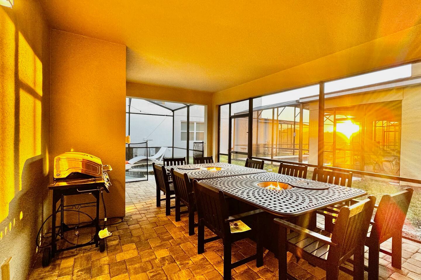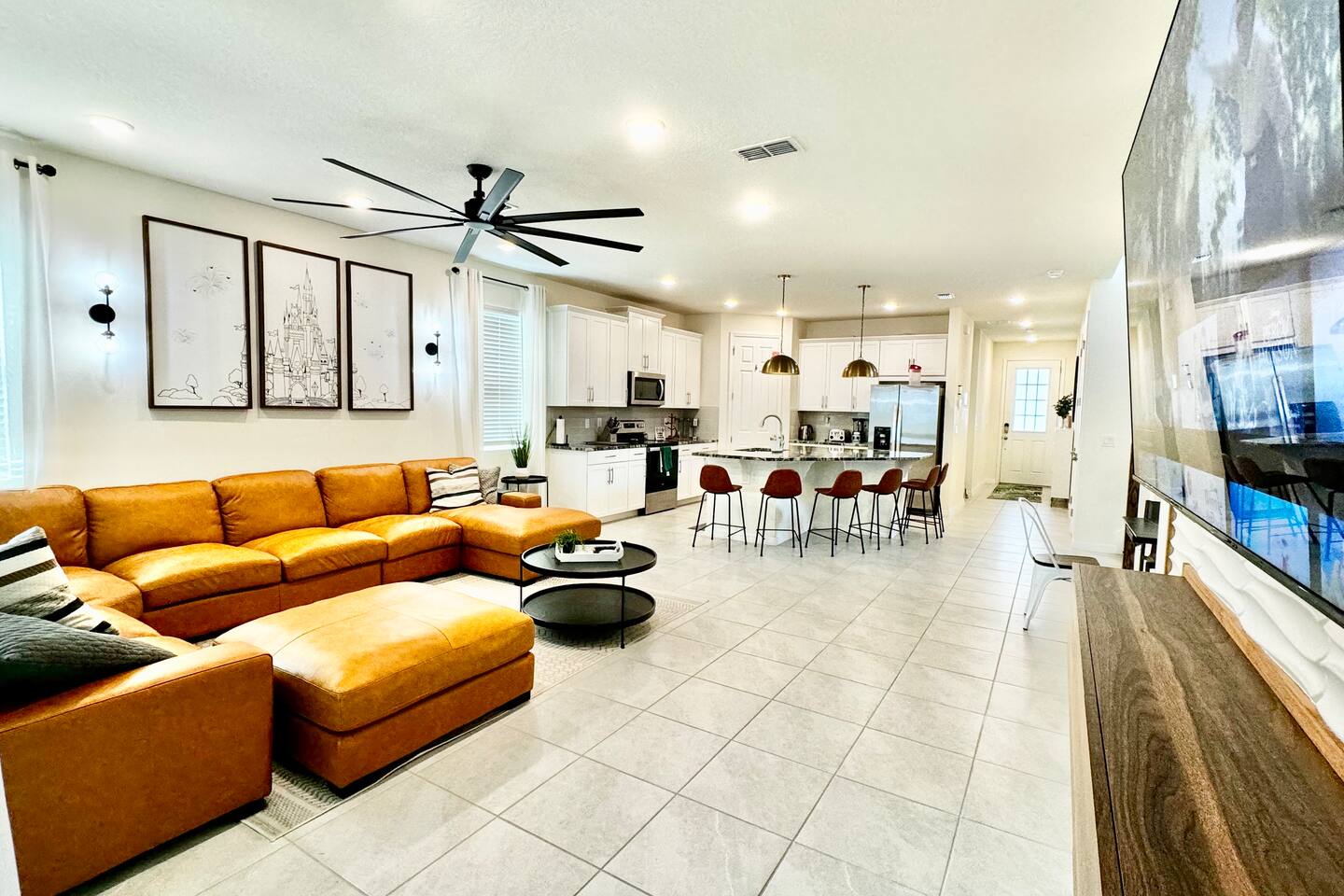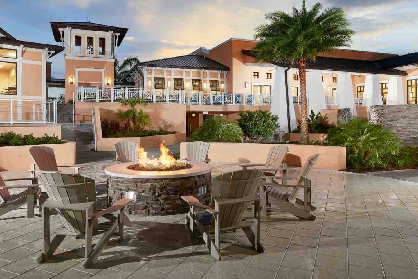 4 miles from Disney! Short drives to all entertainment options. New and professionally designed for your fun and relaxing vacation. 3 themed kids rooms and 3 more king size rooms with ensuites! Loaded with a large heatable pool and spa, covered lanai with outdoor dining space and fire pits, large theater, and a workspace. Stocked with all necessities from a Keurig, K cups, Ninja blender, to paper and bathroom supplies. Enjoy Solara Resort! Surf the Flow Rider and other resort amenities!
