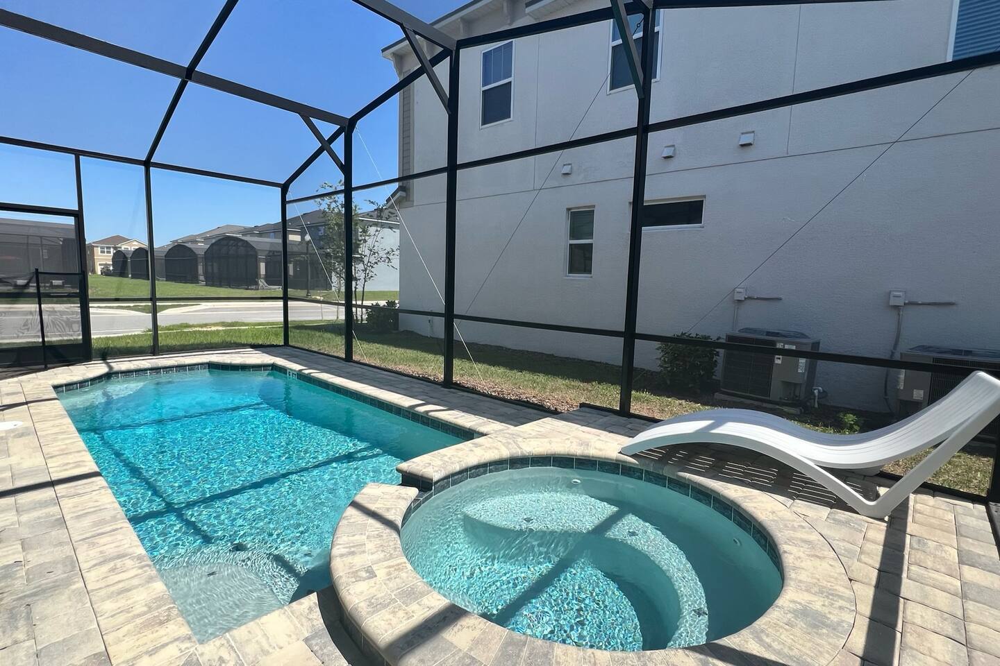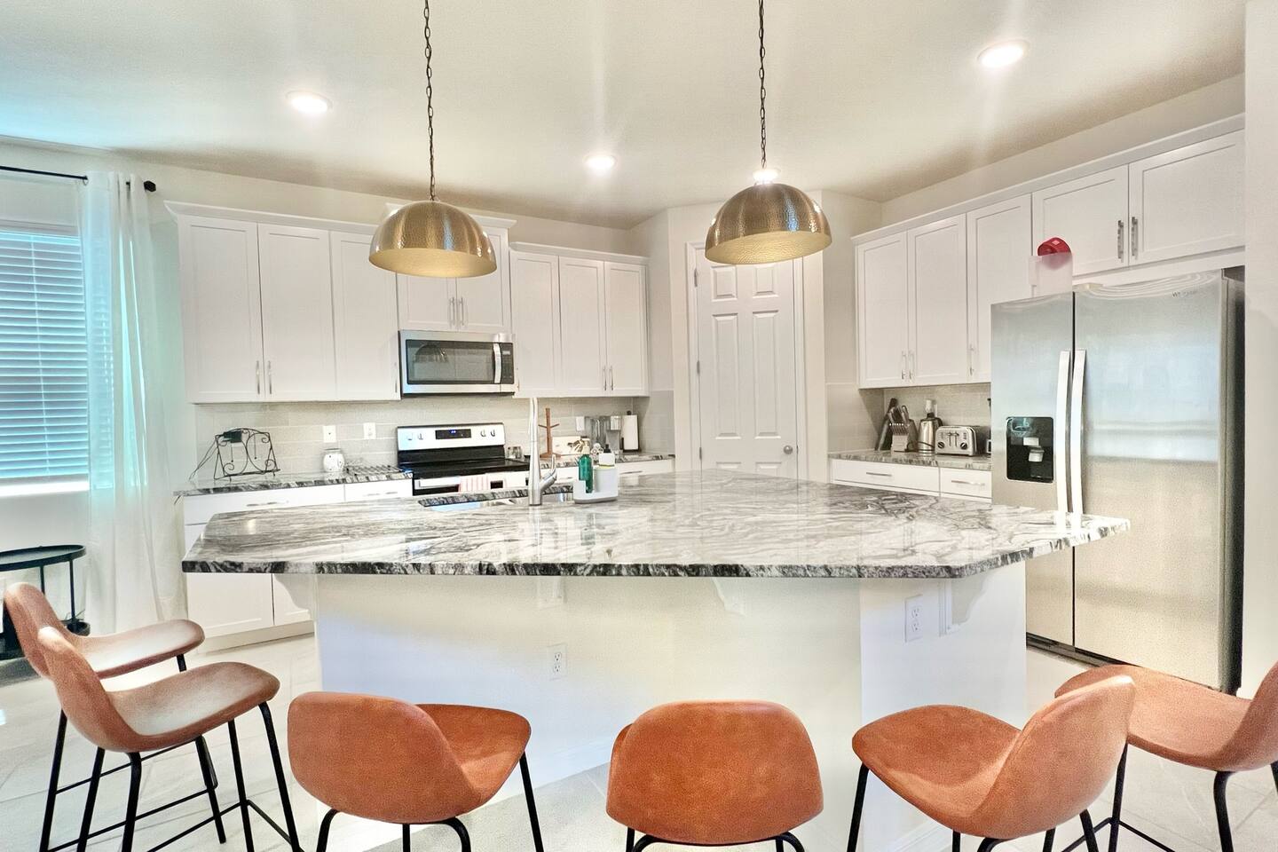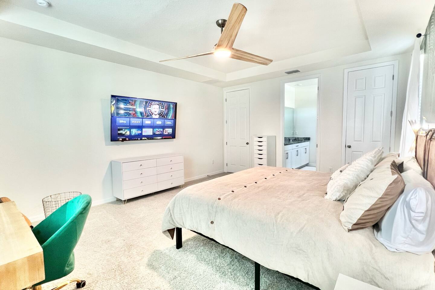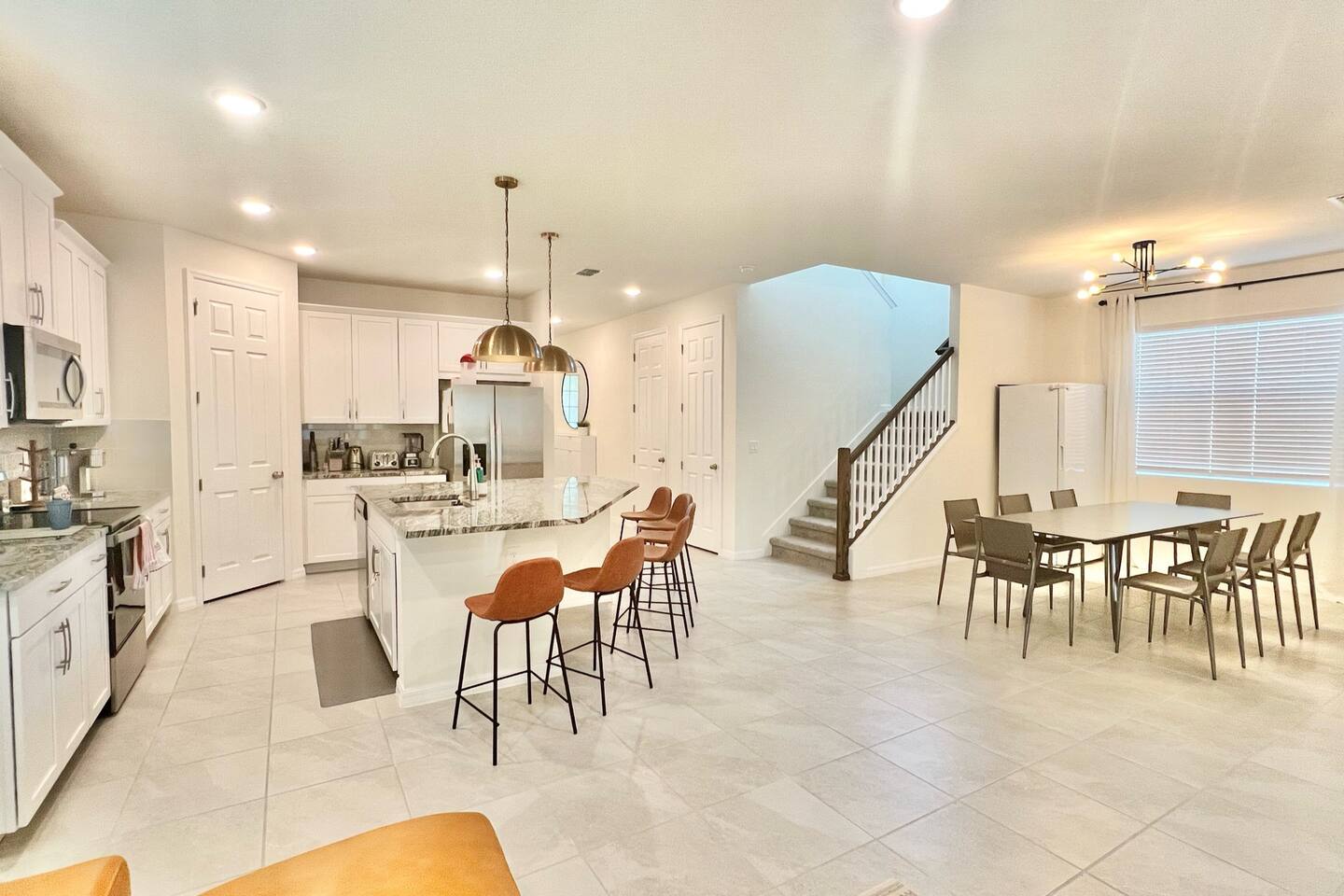 4 miles from Disney! Short drives to all entertainment options. New and professionally designed for your fun and relaxing vacation. 3 themed kids rooms and 3 more king size rooms with ensuites! Loaded with a large heatable pool and spa, covered lanai with outdoor dining space and fire pits, large theater, and a workspace. Stocked with all necessities from a Keurig, K cups, Ninja blender, to paper and bathroom supplies. Enjoy Solara Resort! Surf the Flow Rider and other resort amenities!